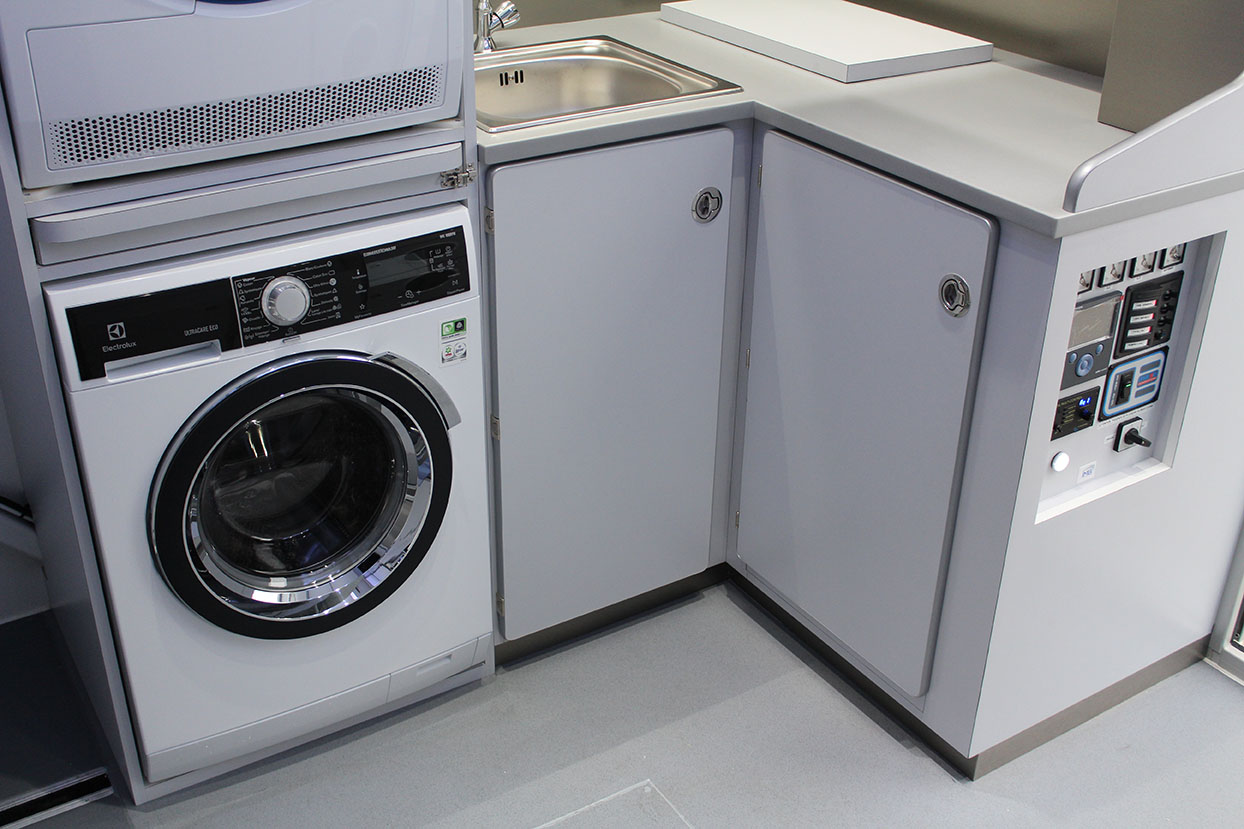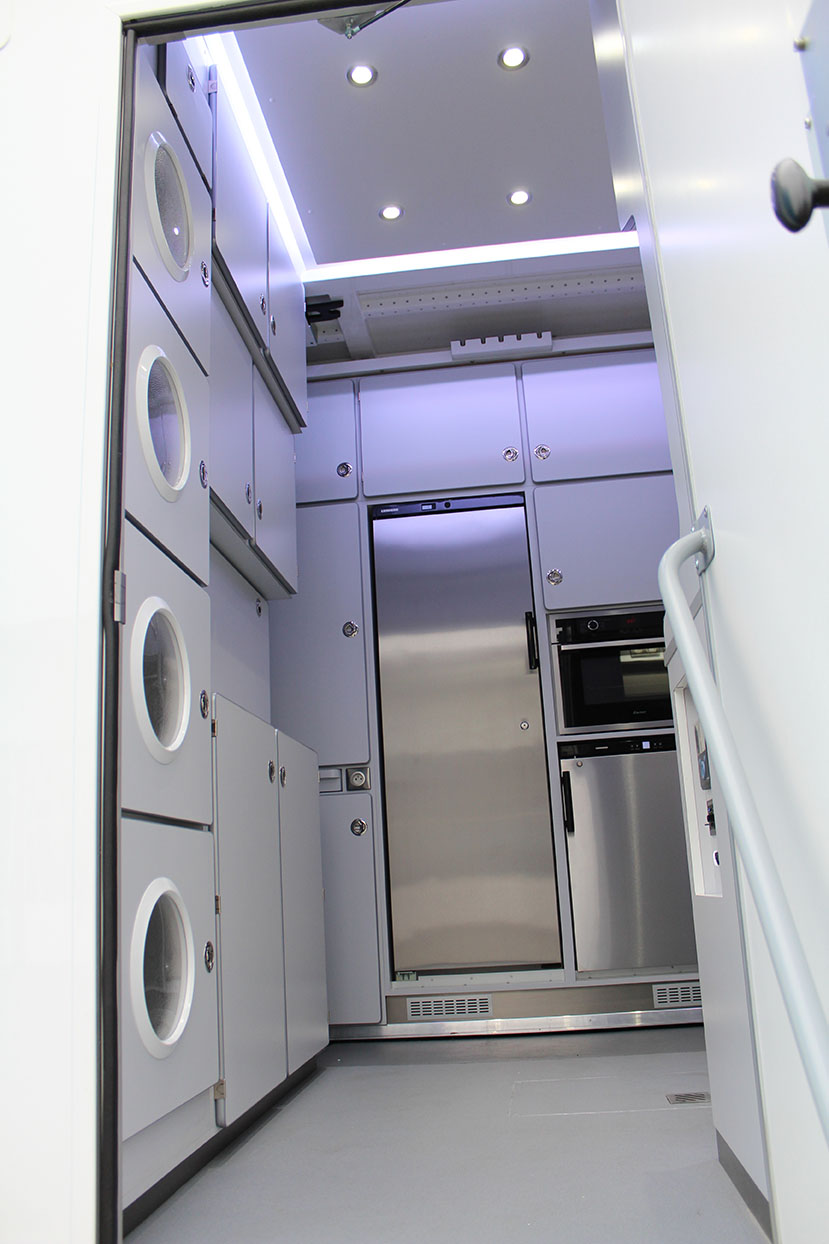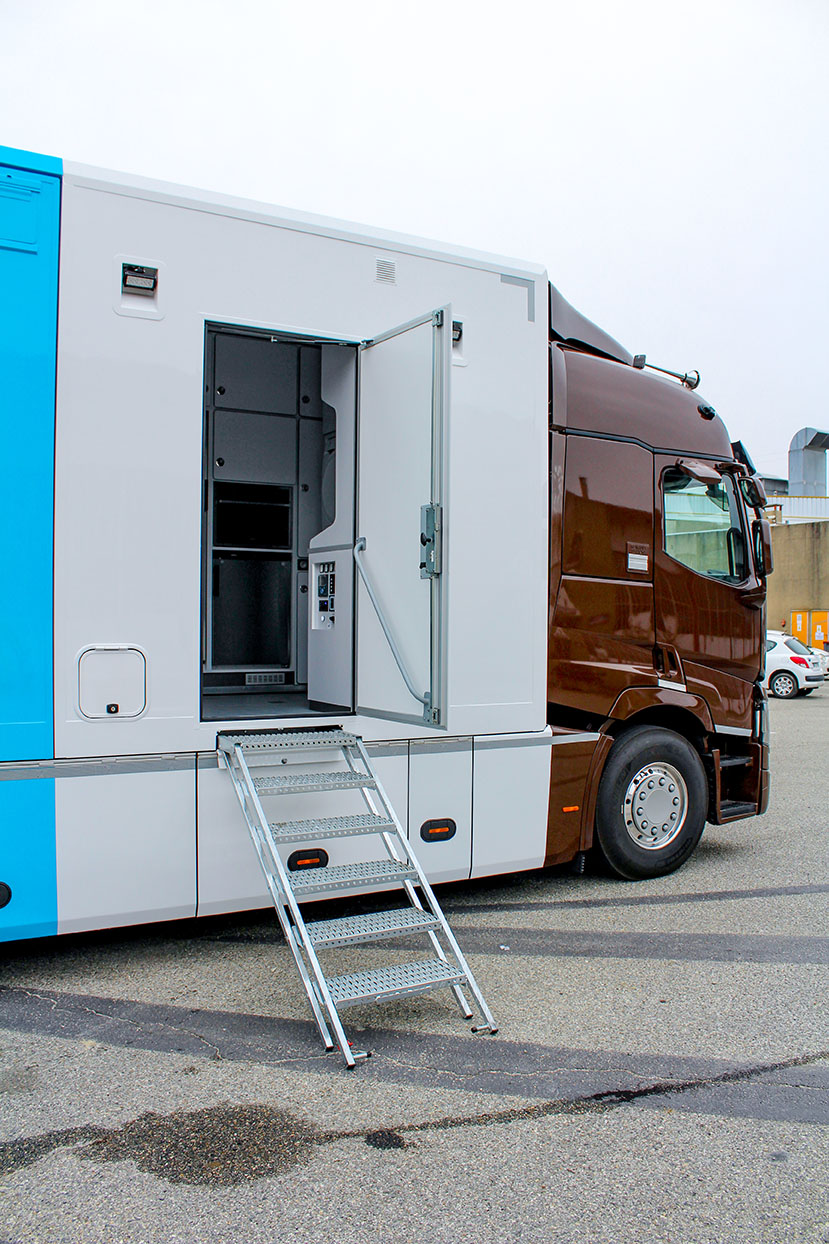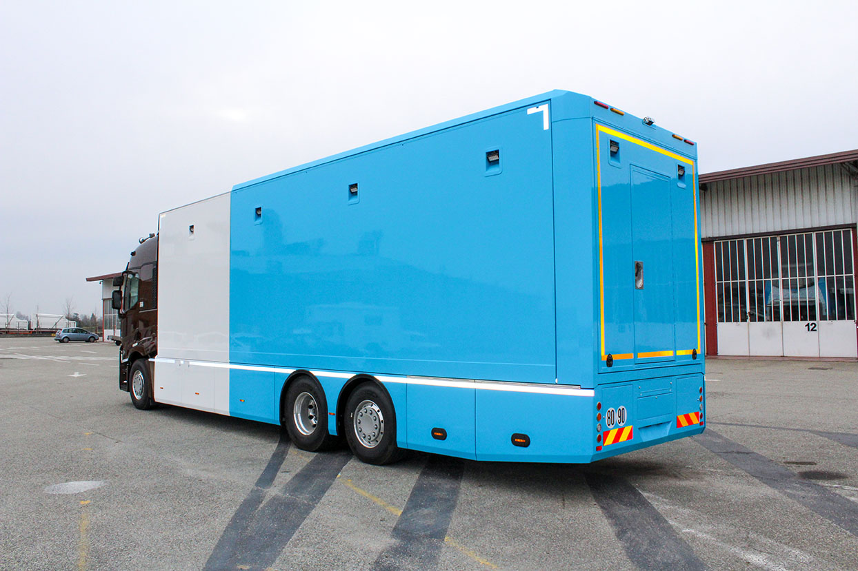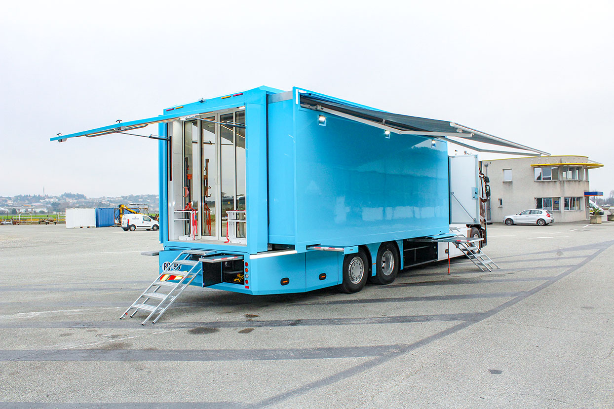 A partir d’un porteur nu, il a fallu créer et monter une structure mécano-soudée afin de supporter le mécanisme des trois parties extensibles et la caisse. L’atelier tôlerie a réalisé toute la carrosserie. La structure, mesurant plus de 9620 mm, pour une largeur totale de 2550 mm et une hauteur de 2650 mm, est composée de panneaux isolées d’une épaisseur de 50 mm. L’atelier a également réalisé toutes les prédispositions (le système hydraulique, le passage des énergies et le réseau d’eau) et l’installation électrique.