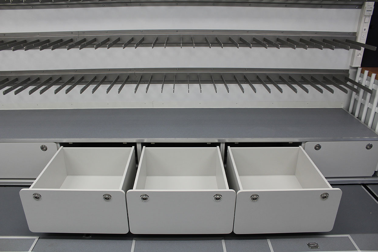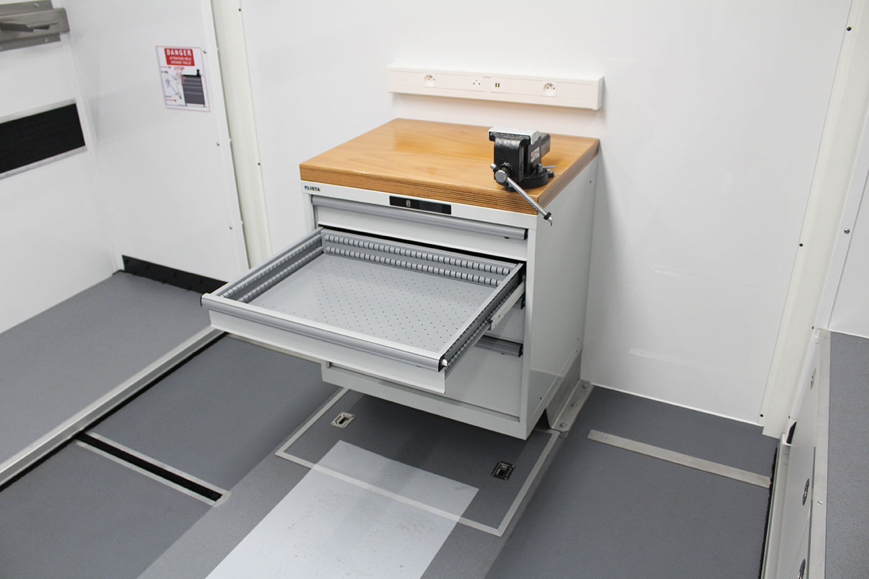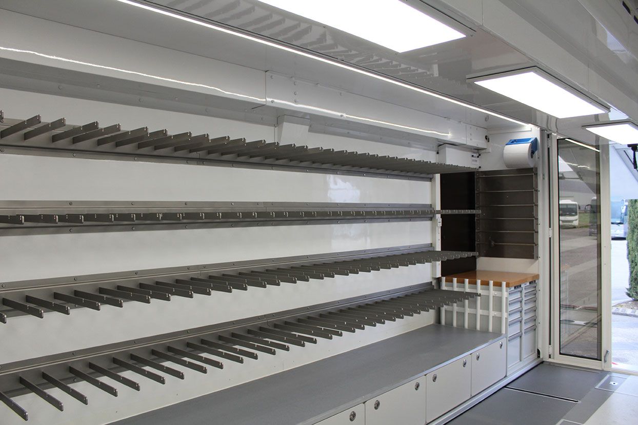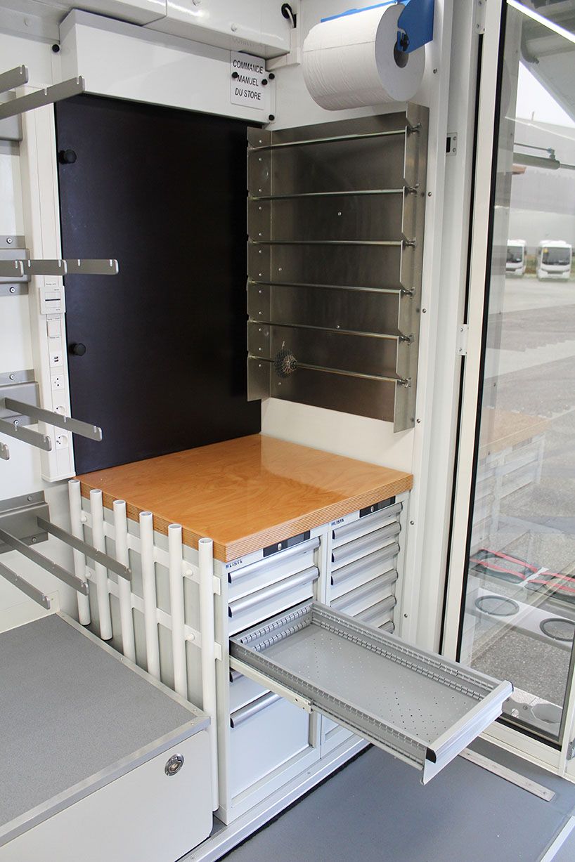 Le compartiment ‘Atelier’ est, quant à lui, dédié à l’entretien des vélos de course durant toute la durée des épreuves sportives. L’aménagement comprend :