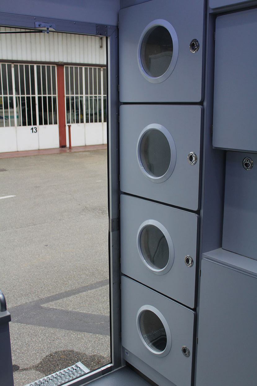 A ces deux compartiments s’ajoutent des coffres dans le soubassement du véhicule pour le stockage de nombreux équipements tels qu’un groupe électrogène, un nettoyeur haute pression, un compresseur d’air... .